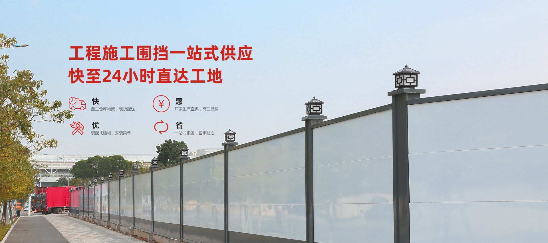 旭東施工圍擋,在建筑領(lǐng)域廣獲客戶好評(píng),具有自主技術(shù)優(yōu)勢(shì)的裝配式圍擋A款、鋼結(jié)構(gòu)圍擋C款、PVC圍擋和定制圍擋等產(chǎn)品,廣泛應(yīng)用于房屋、路橋和地鐵等建設(shè)施工現(xiàn)場(chǎng)和項(xiàng)目部的周圍,是城市文明施工的一道安全屏障。